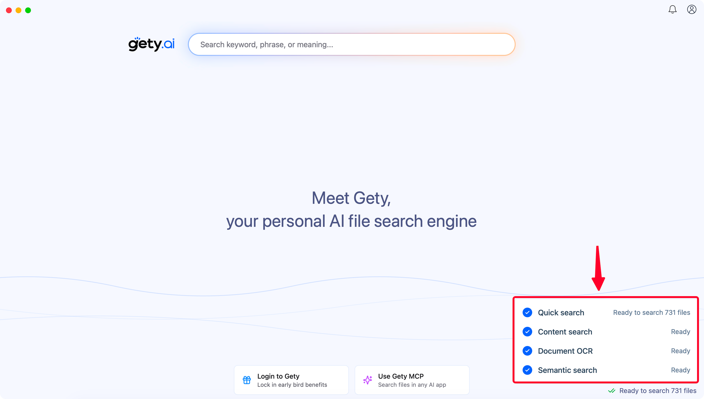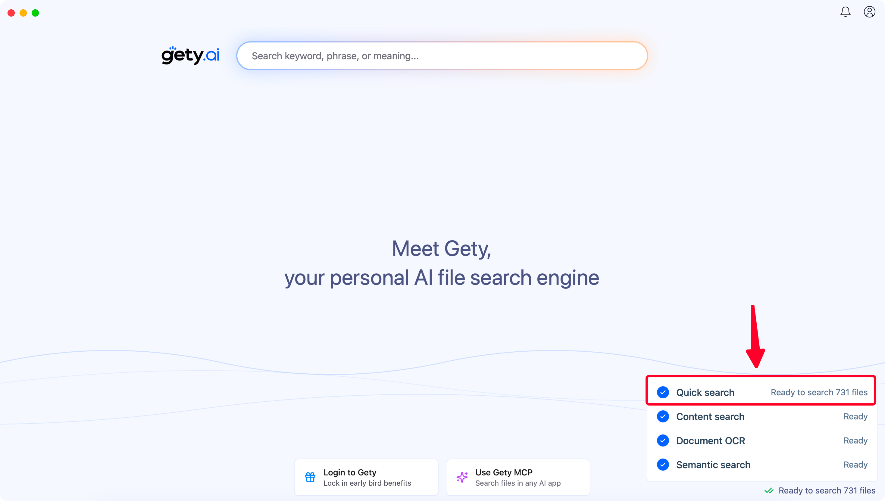 - Semantic search: Even if you don't remember the exact words, Gety understands your intent. Searching for "contract" might find files containing "agreement" or "statement of work" based on meaning, not just keyword matching