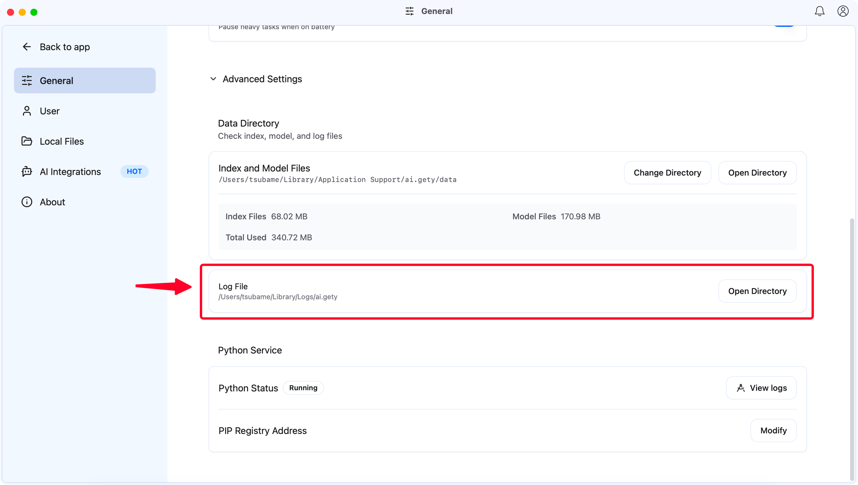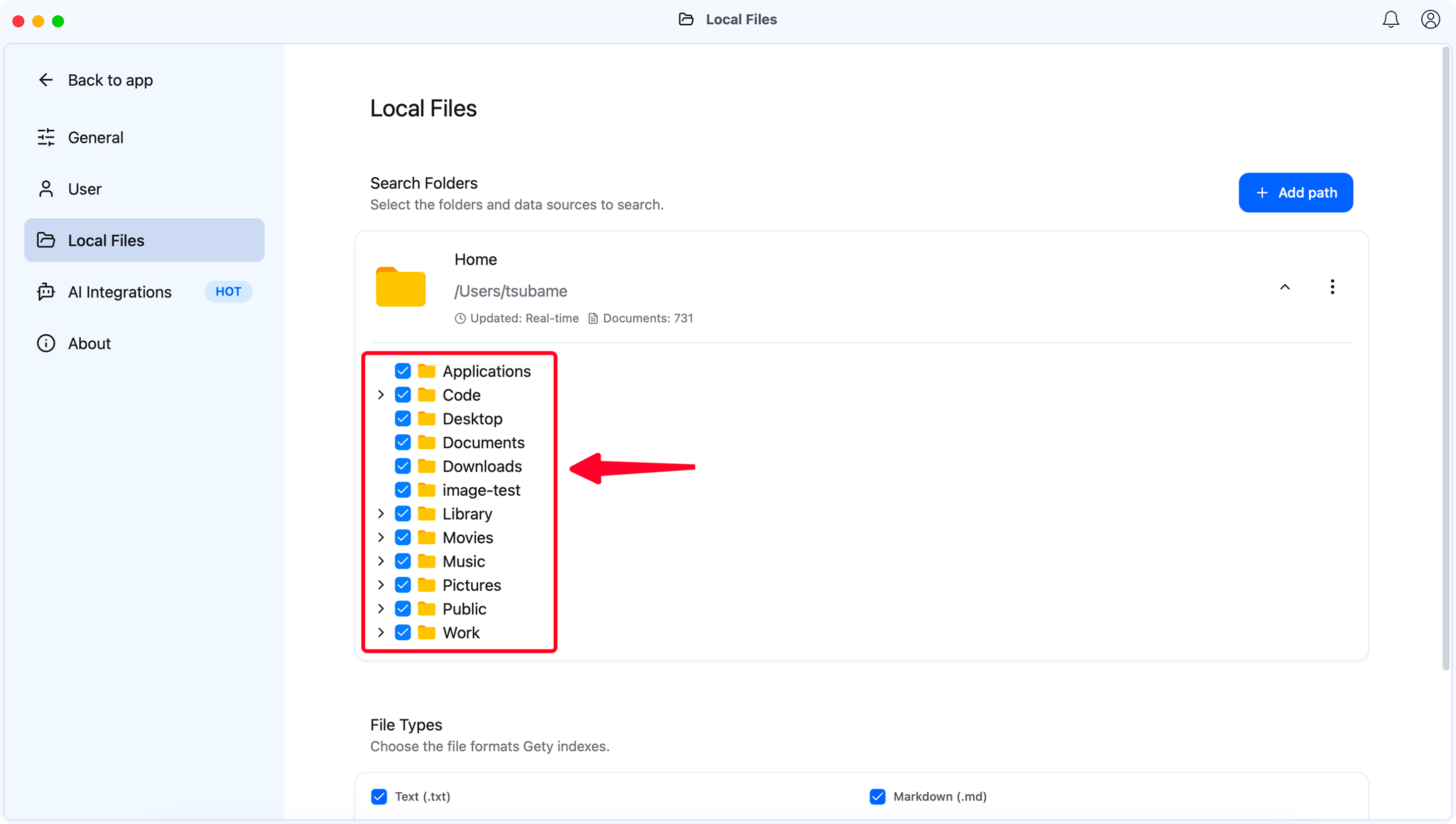 Go to Settings → AI Integration. Gety offers two ways to let AI access your local files:
