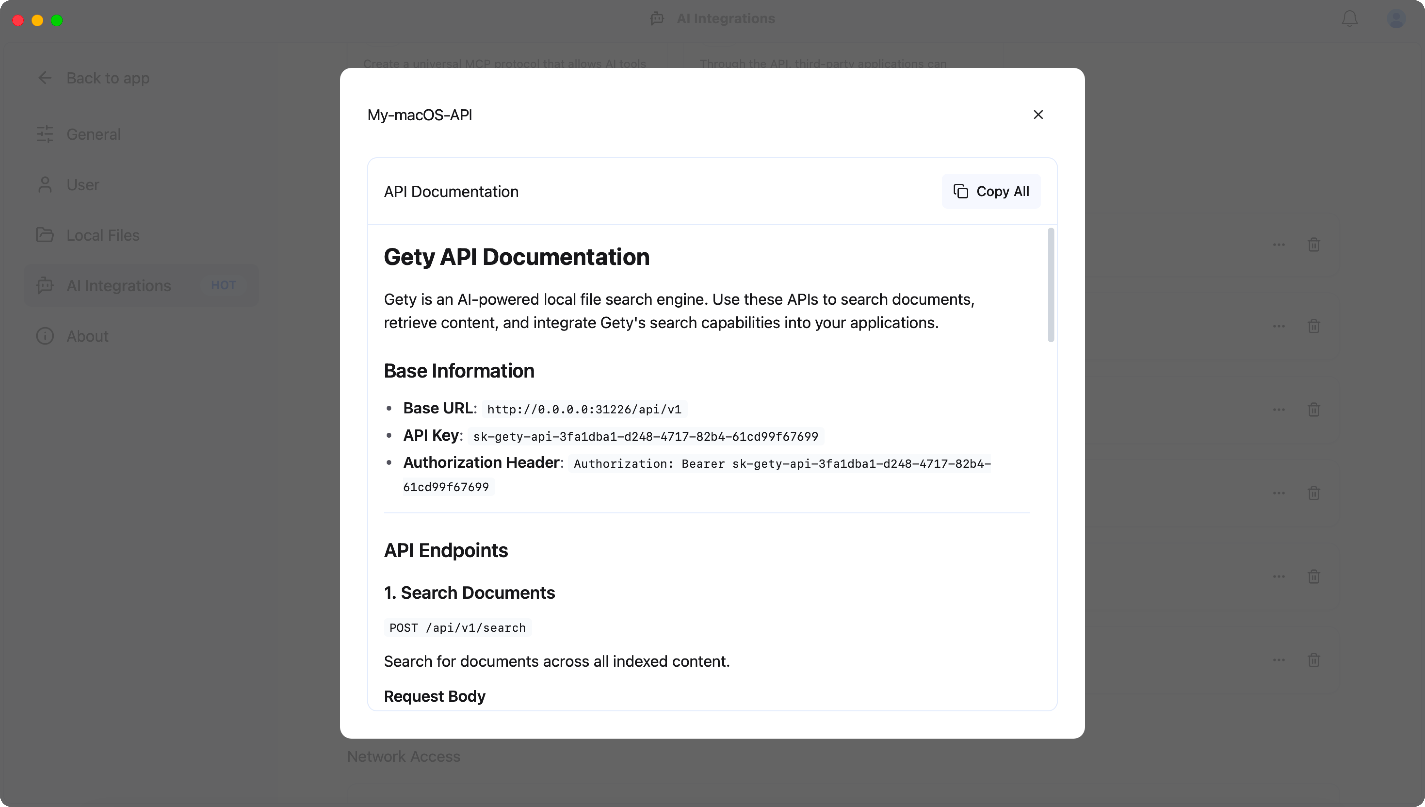On Mac (the device being searched), open Gety and go to Settings -> AI Integrations -> Network Access: