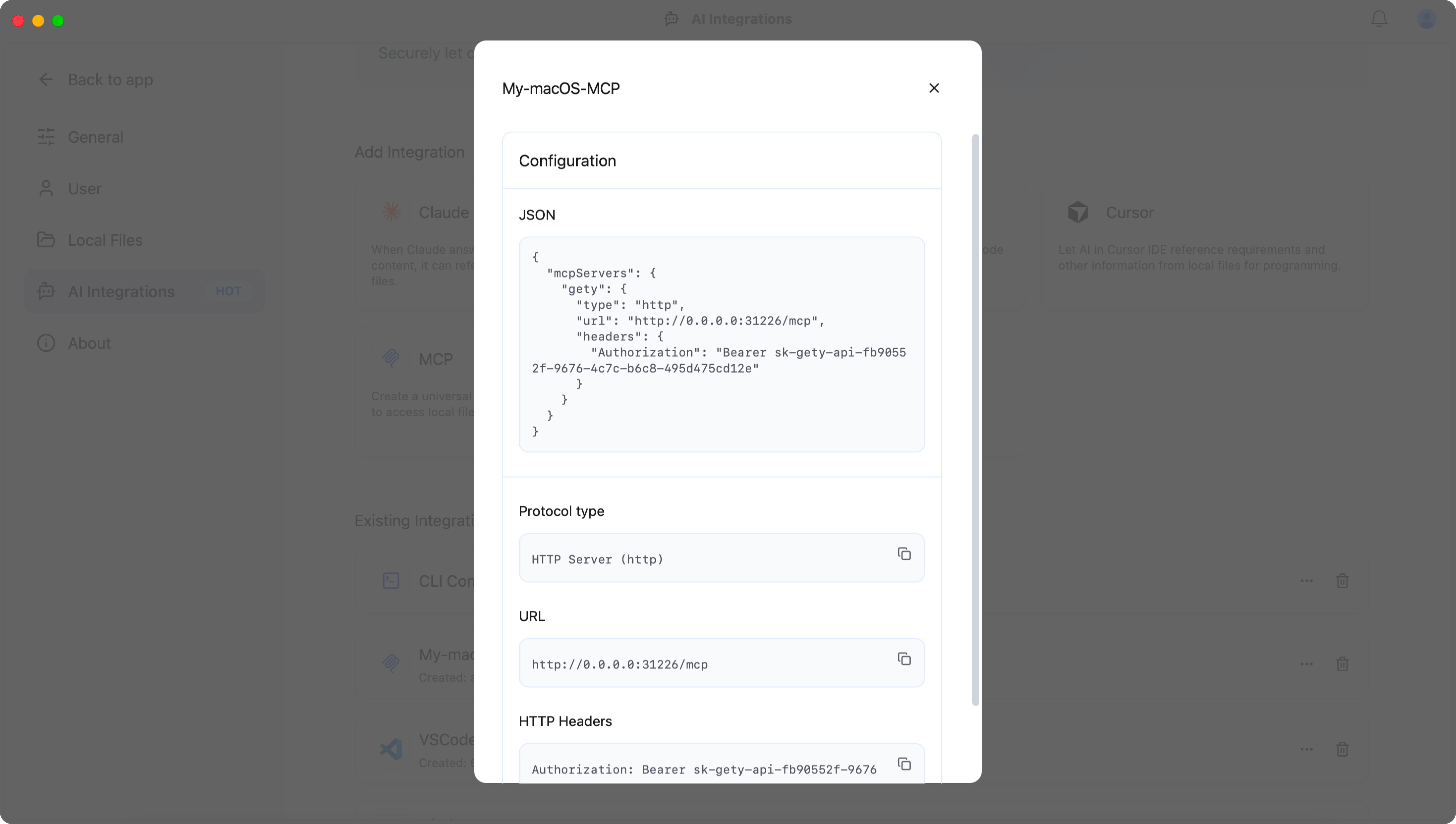 On Mac (the device being searched), open Gety and go to「Settings -> AI Integrations -> Add Integration」, select MCP, enter a name (e.g. My-macOS-MCP), and click Create.