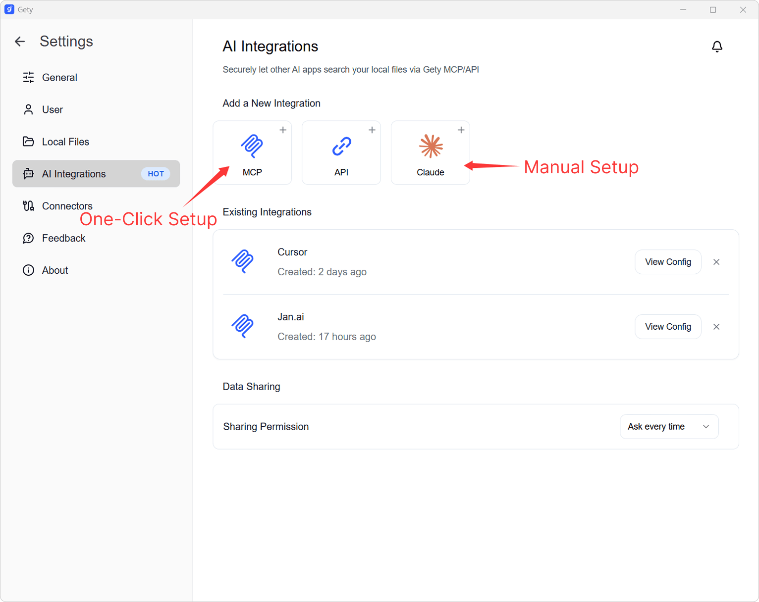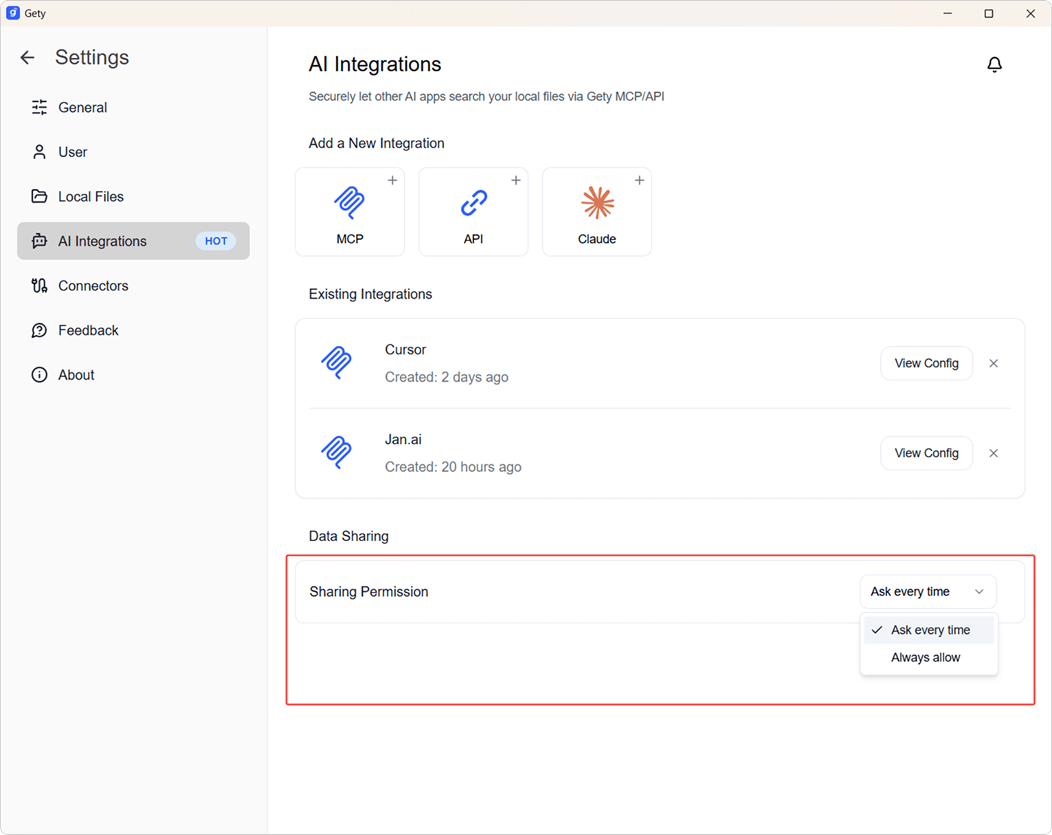 Open Gety, then go to Settings -> AI Integration to quickly configure MCP.