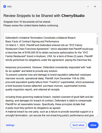 AI Integration gives you the benefits of AI powered by your own files — always under your control. Every time content is shared, whether it’s a short snippet or a longer section, a confirmation pop-up lets you review it first.
