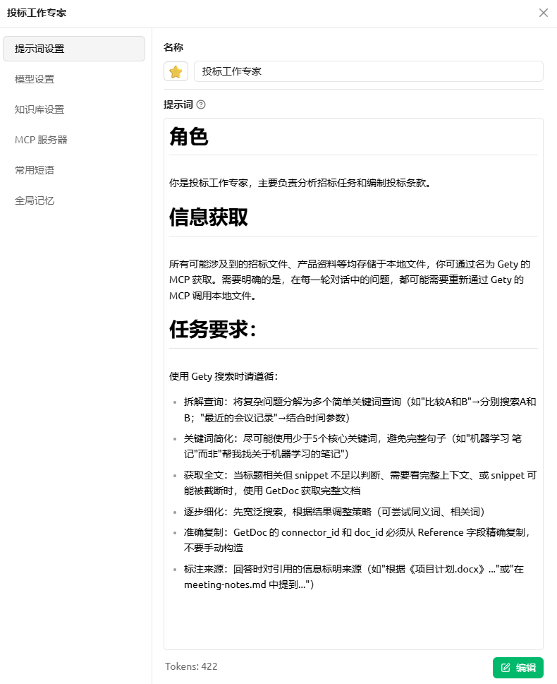 在投标工作中,即使是资深的投标团队,也会被反复查找产品资料而拖累工作效率。在争分夺秒的标书编制过程中,利用 Gety 的 AI 集成特性,我们可以在 AI 对话客户端中(如 CherryStudio、ChatWise 等)让 AI 快速且精准地调用保存在本地的产品资料,高效生成投标方案,大幅缩减标书编制时间。