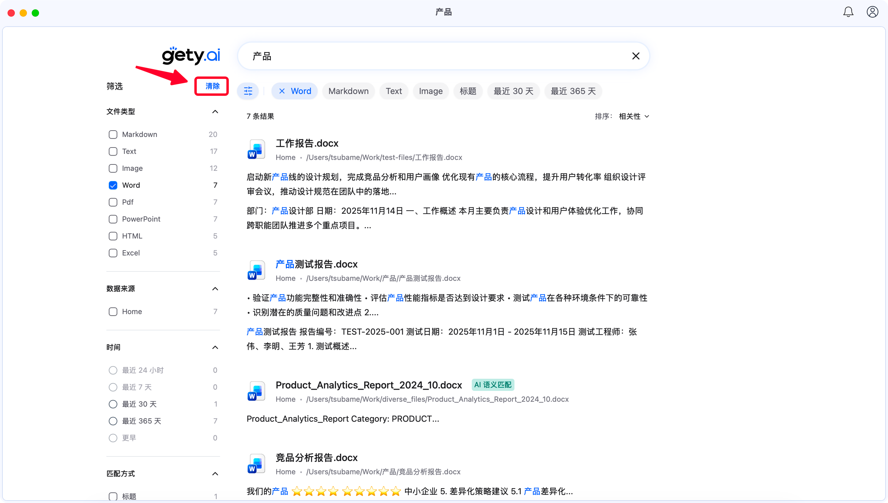 - 关键词搜索:直接输入关键词,Gety 会快速扫描文件的完整内容并即时返回结果
